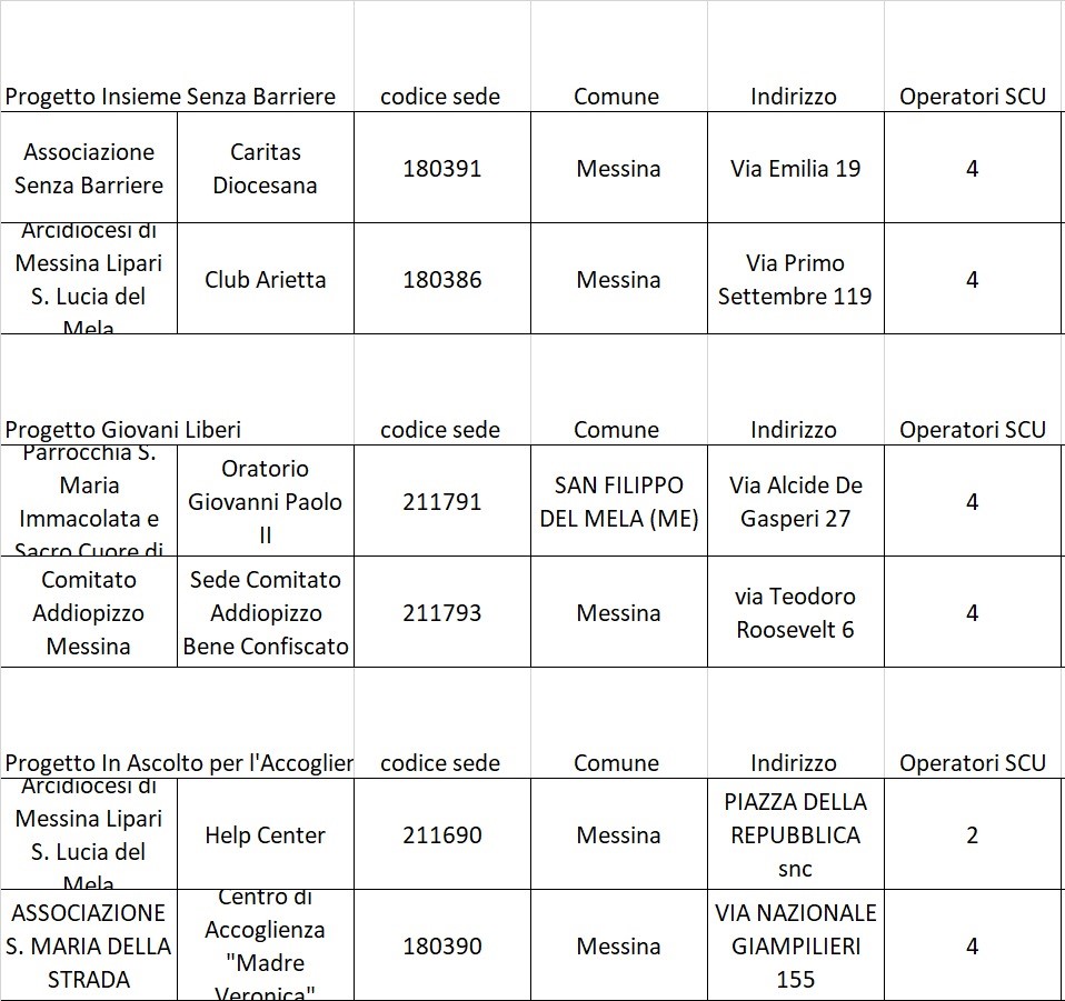 I progetti della Caritas di Mesisna hanno una durata di 12 mesi, con un orario di servizio con un monte ore annuo di 1.145 ore per i progetti di 12 mesi articolati su cinque o sei giorni a settimana.